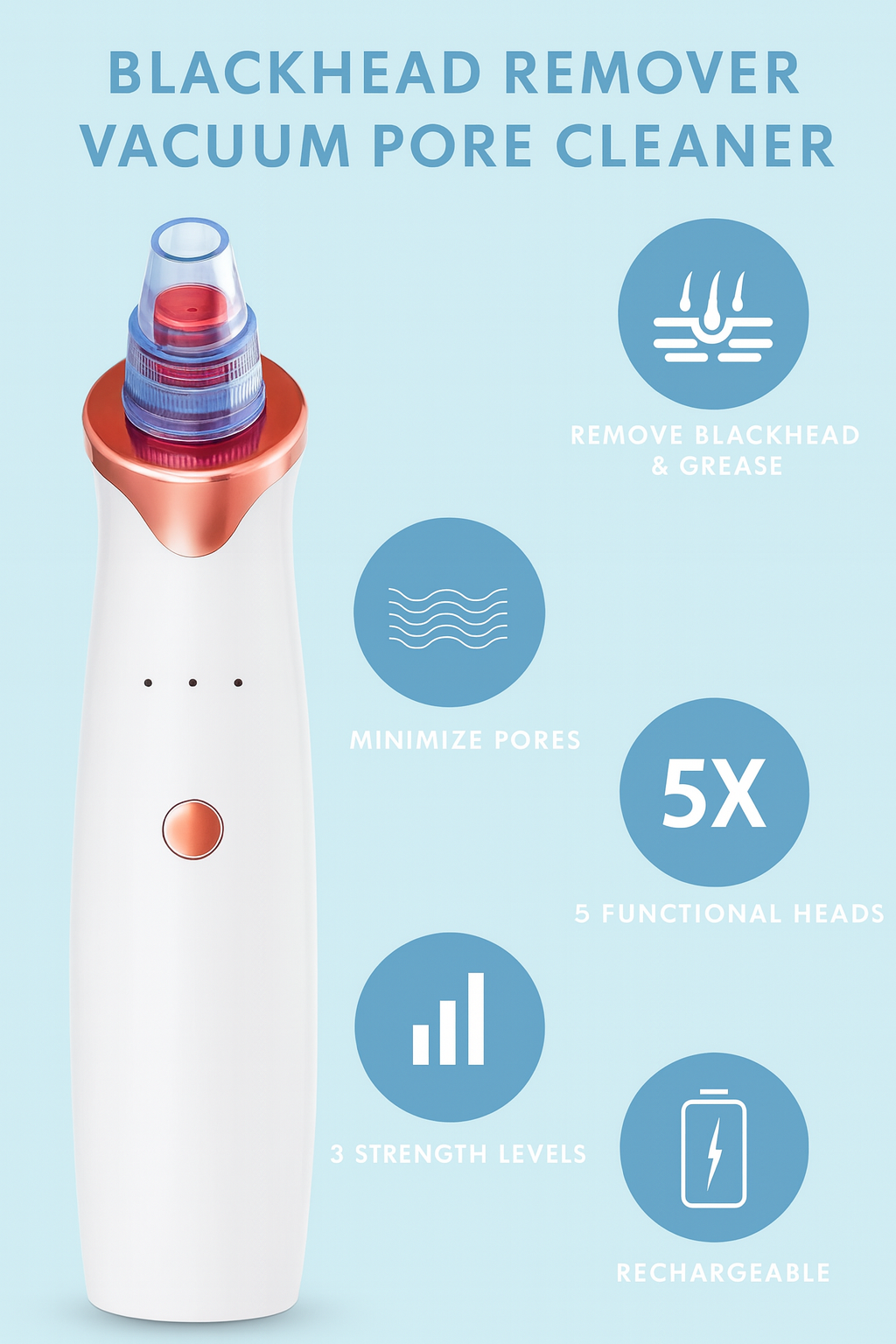 The Velanca SkinVac™ is the simple, effective solution for stubborn blackheads and clogged pores. Using gentle suction, it lifts away dirt, oil, and impurities while keeping your skin safe from irritation. With customizable suction levels and interchangeable heads, it adapts to your unique skin needs—whether targeting your nose, cheeks, or chin. Compact, rechargeable, and easy to use, the SkinVac helps you achieve smoother, clearer, more radiant skin anytime, anywhere.
