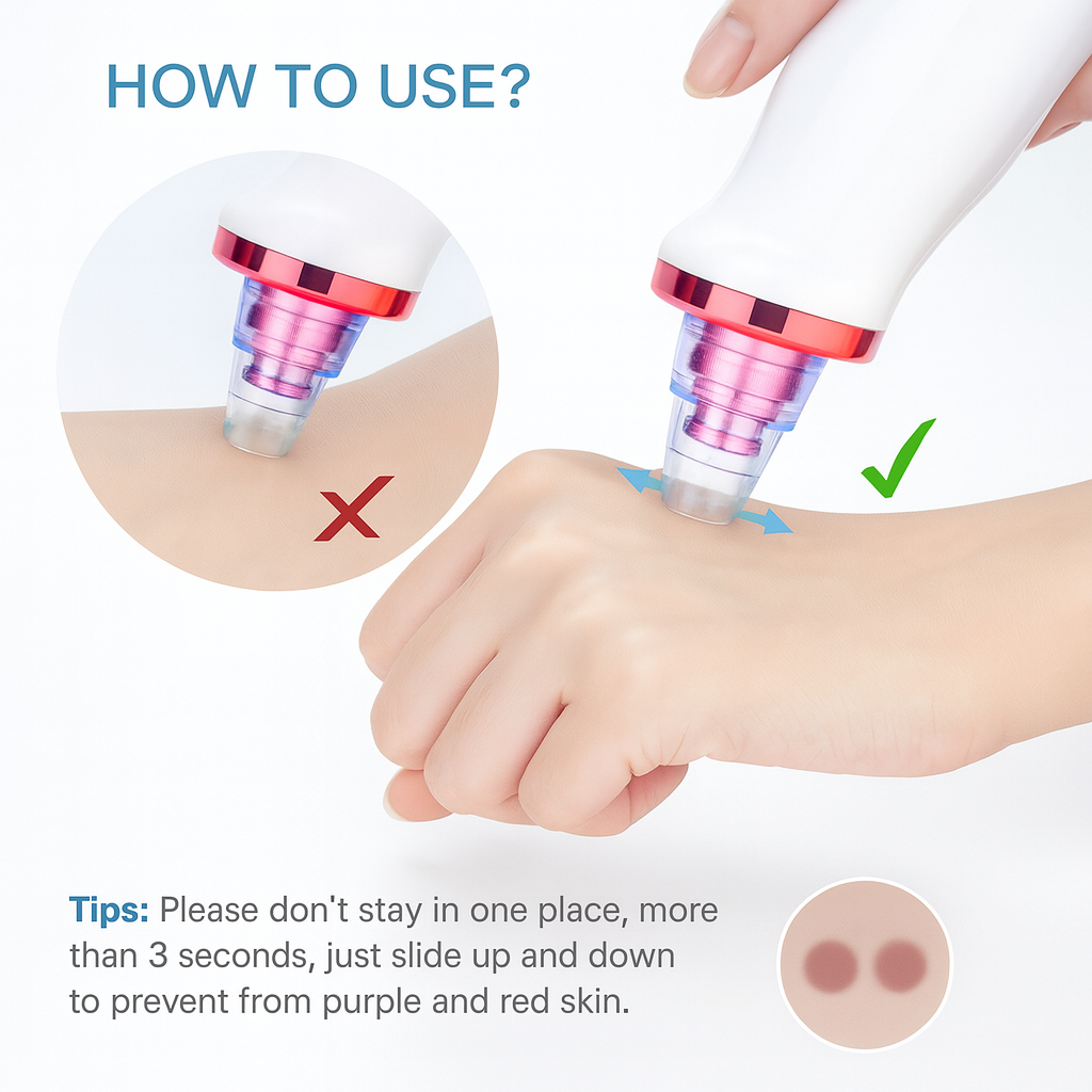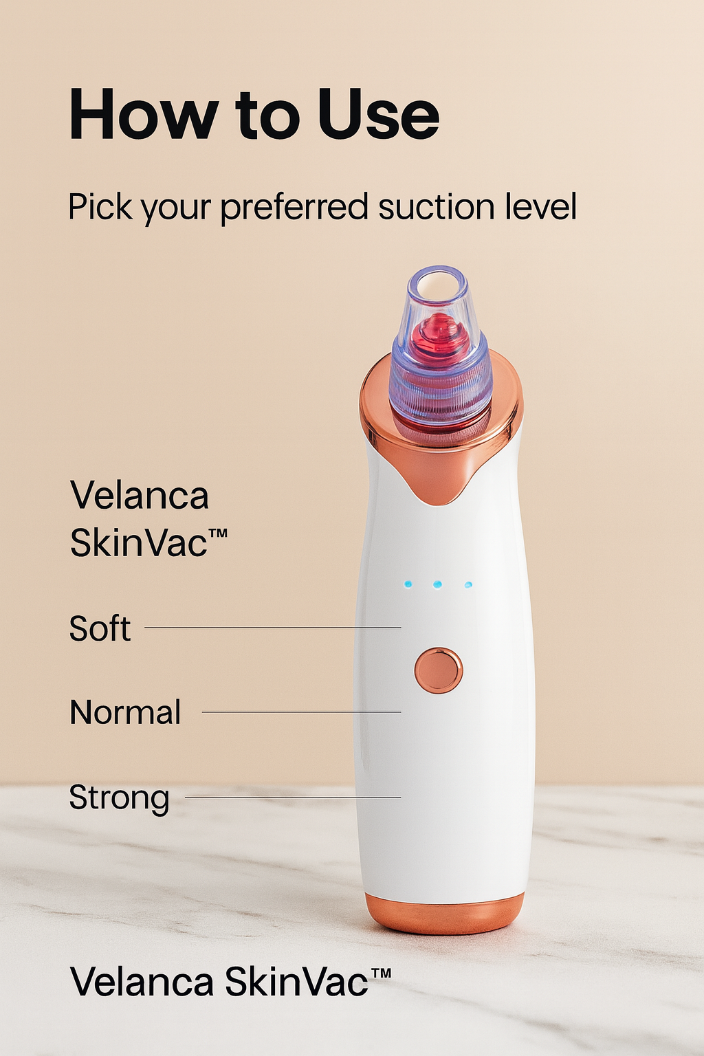 Start with clean, dry skin. Power on the Velanca SkinVac™ and select your preferred suction level. Gently glide the device over your face, focusing on areas with blackheads, oil, or clogged pores—such as the nose, chin, and forehead. Use the interchangeable heads to target different skin needs. For best results, apply a warm towel or steam before use to open pores, then finish with your favorite moisturizer.